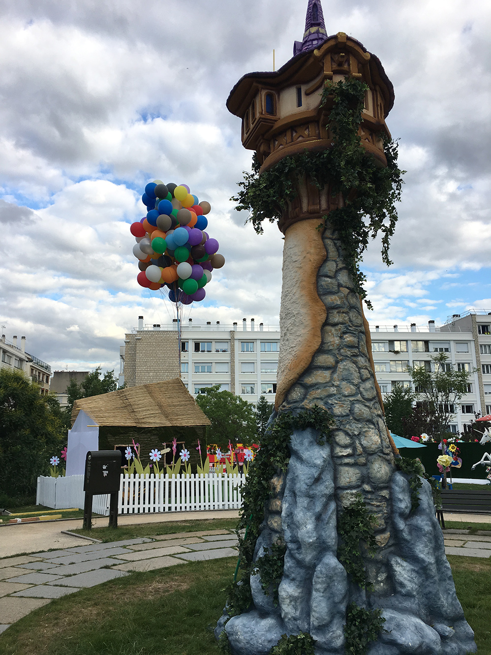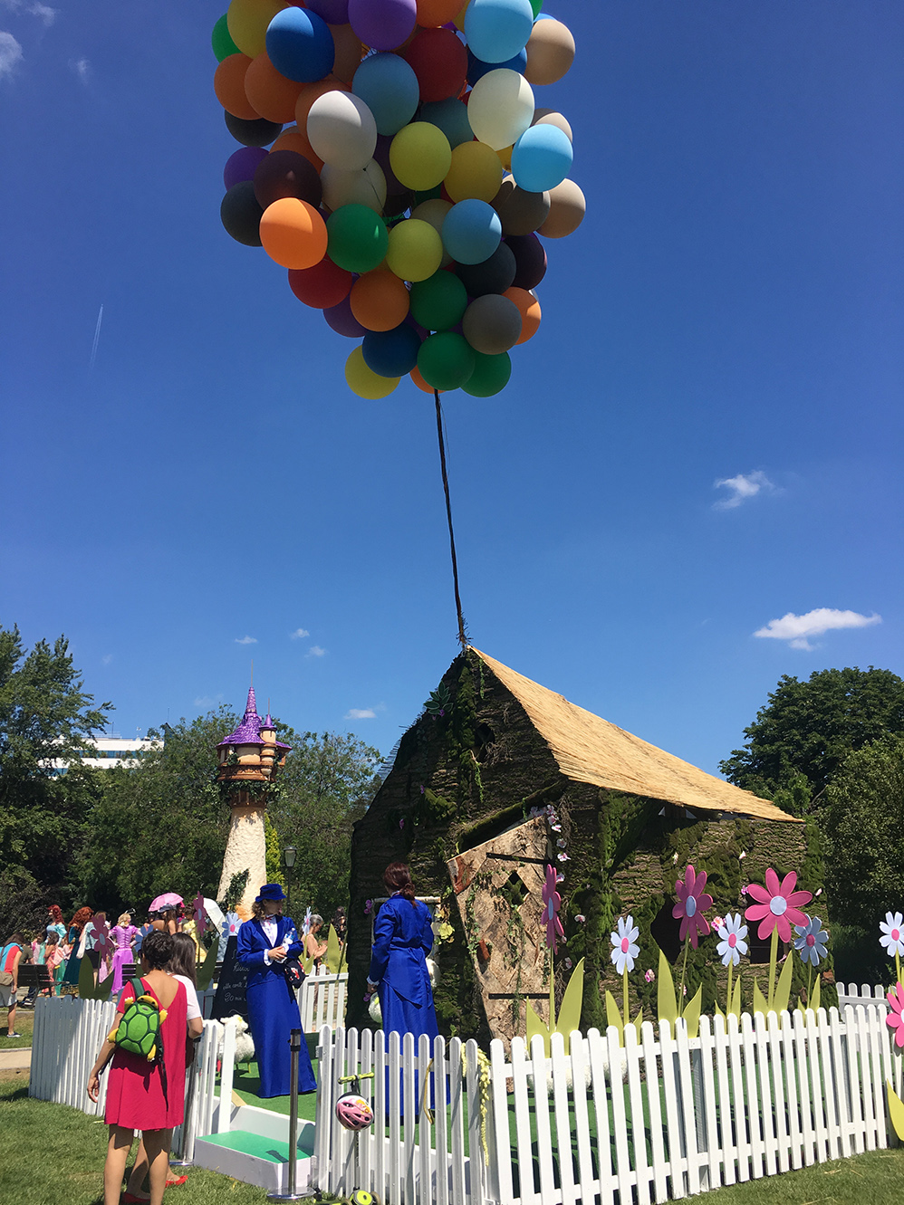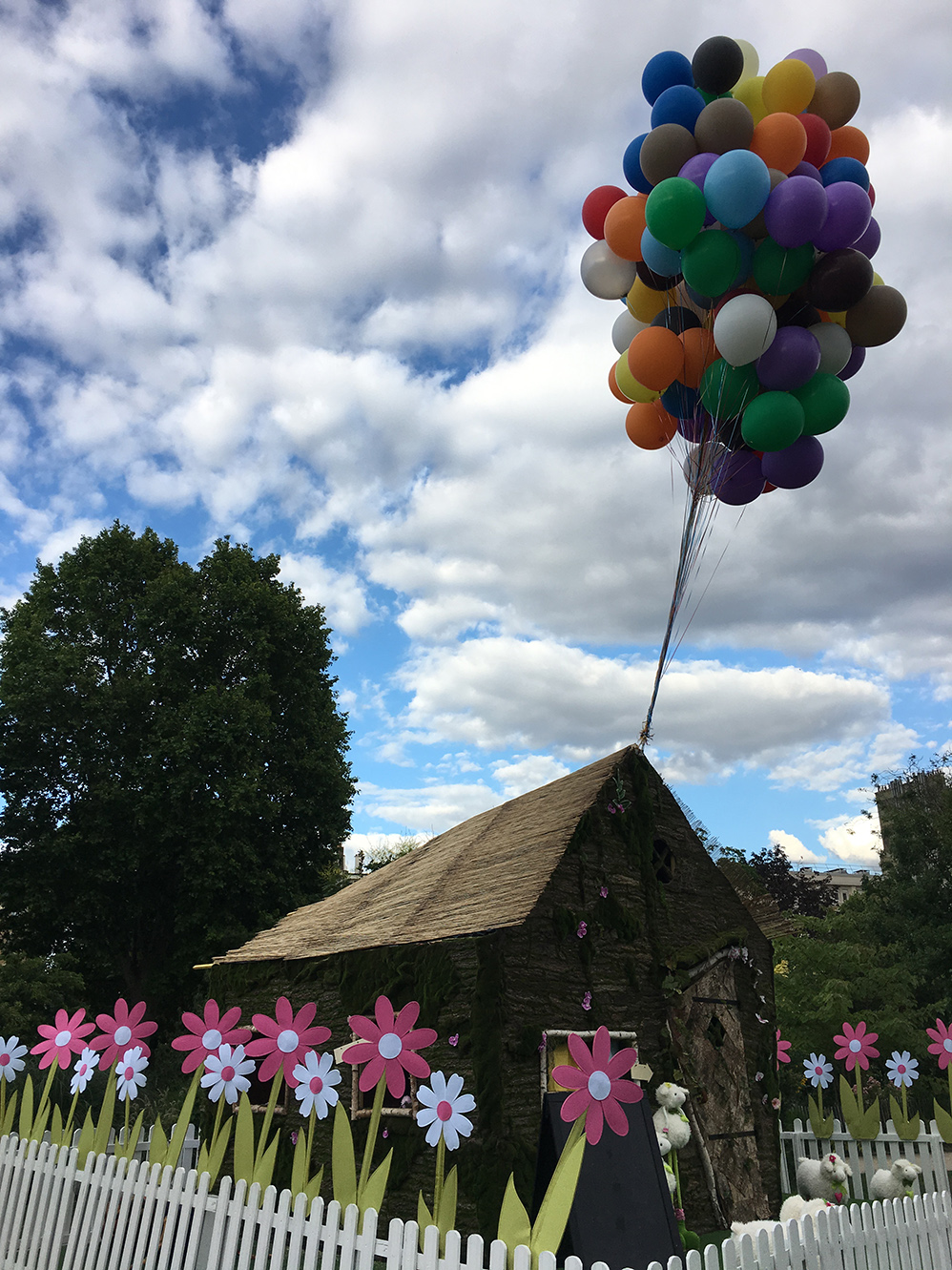 – 130 ballons de baudruche 60cm gonflés à l’hélium pour créer une grappe de ballon au dessus d’une petite maison comme dans le film La-Haut de Walt Disney.