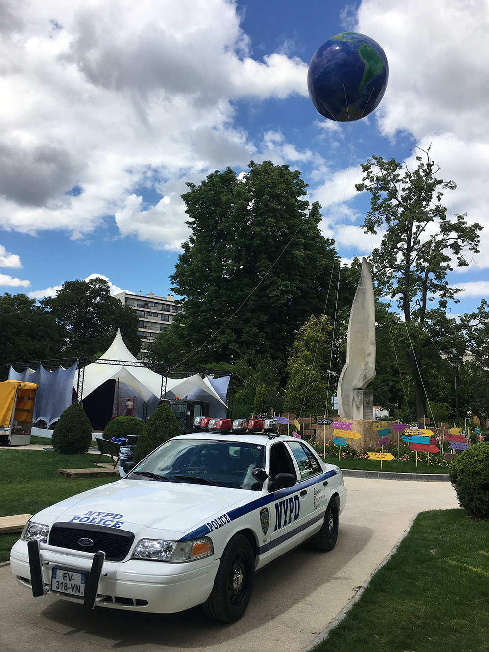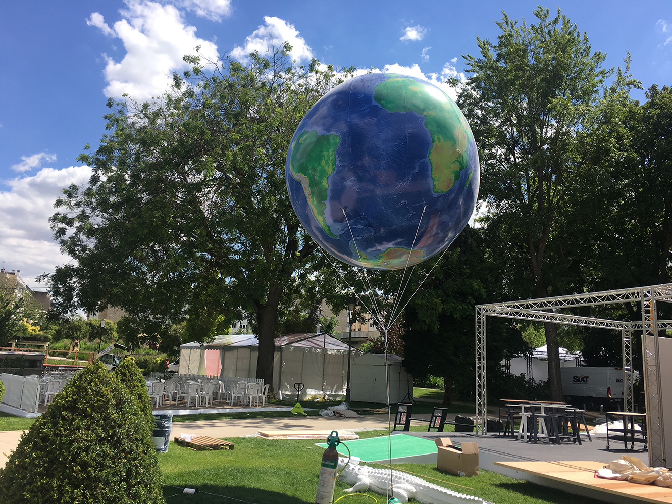 – Un ballon PVC mappemonde de 3m gonflé à l’hélium installé au dessus d’une colonne.