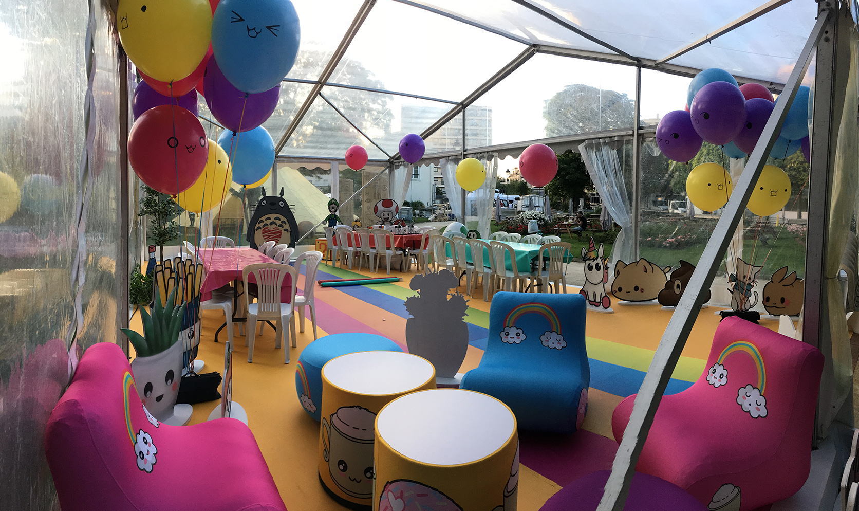 – Des meubles gonflables entièrement imprimés (4 fauteuils, 2 poufs et 2 tables basse).